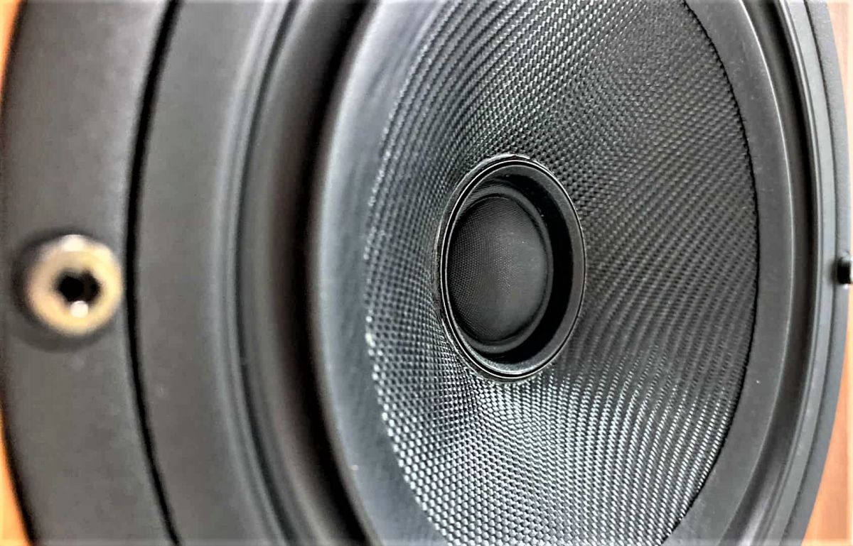 - Haut-parleurs : cône en fibre de carbone de 6,5 ” servant de guide d’ondes pour dôme en tissu de 1,45 ”, aimant en néodyme