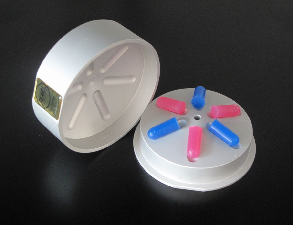 Chaque isol-coupling est en 3 parties : une base surmontée d’un capot prenant en sandwich 6 éléments absorbants de forme cylindrique maintenus en place grâce à leur empreinte taillée sous et au-dessus de chacun.