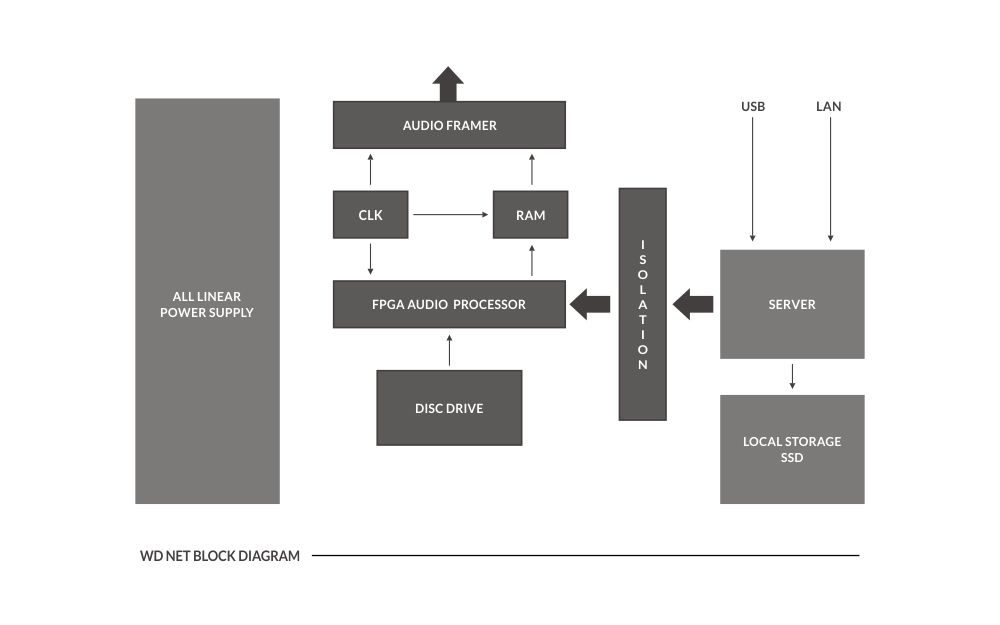Le Wavedream NET est construit autour d’un puissant noyau audio numérique, qui diffuse toutes les données audio dans une grande mémoire tampon RAM. Les données audio sont synchronisées après une horloge maîtresse à bruit de phase ultra faible, ce qui fait que la machine est proche d’une source idéale. Le puissant moteur FPGA prend en charge en mode exclusif la lecture du disque, qui est totalement séparée par la partie serveur.